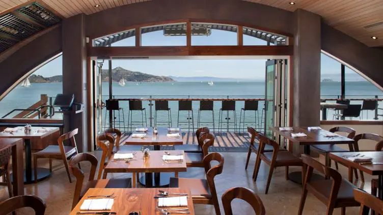 Perched directly on the water’s edge, it combines sweeping panoramas of San Francisco Bay with a buzzing, wood-clad interior that feels effortlessly Californian. We arrived on a crisp winter evening, the bay glittering under twilight as ferries chugged past and the city skyline began its nightly sparkle. The restaurant occupies a prime spot on Bridgeway, with floor-to-ceiling windows framing the view like a living painting.