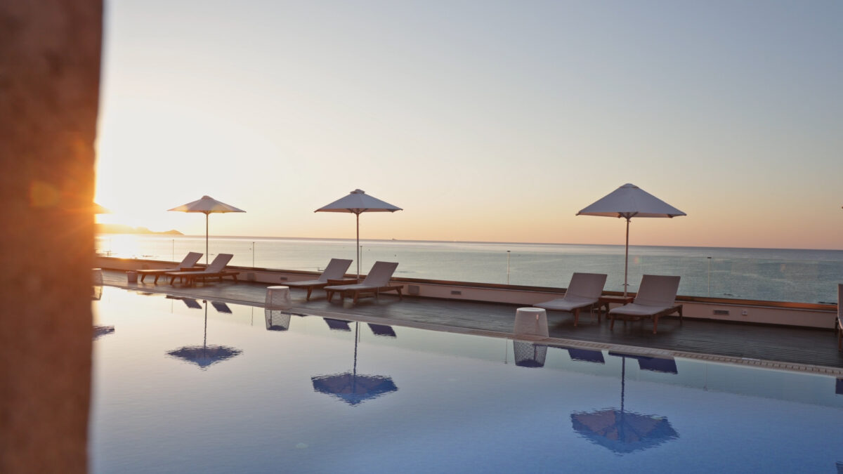 The infinity pool sits above it all, cut cleanly into the terrace with the sea stretching endlessly beyond. It’s the social centre of the hotel in the gentlest possible sense, people reading, floating, dozing. You can spend hours there without a hint of restlessness.