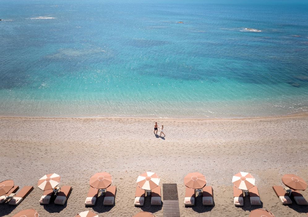 A few steps below the hotel, a quiet strip of private beach waits, pebbly, clear, and open to the horizon. The water here is calm and glassy, the kind that invites long, lazy swims followed by barefoot walks to the loungers. There’s food and drinks service if you want it, or the option to do absolutely nothing, which most people seem to choose.