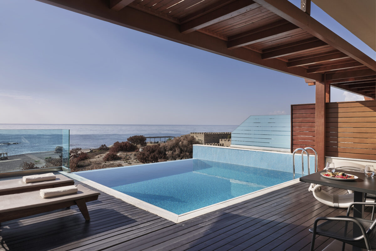 Each suite feels like its own little hideout. Pale stone, soft linen, and glass doors that frame the Aegean like a moving artwork. Most have private plunge pools, which you’ll end up spending more time in than you plan to. Mornings begin with sunlight spilling across the bed; evenings end with that hazy, salt-on-skin feeling that only a Greek island gives you.